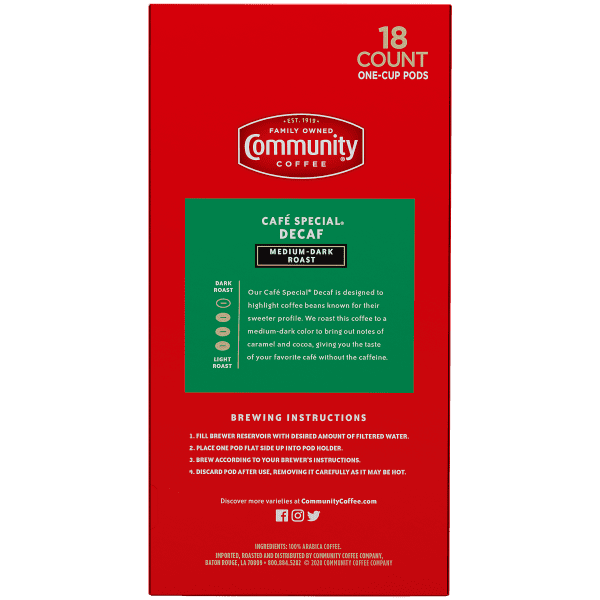 Our Café Special® Decaf is designed to highlight coffee beans known for their sweeter profile. We roast this coffee to a medium-dark color to bring out notes of caramel and cocoa, giving you the taste of your favorite café without the caffeine. Made from 100% select Arabica coffee beans. Place one pod flat side up into the pod brewer and brew according to single-cup brewer instructions.