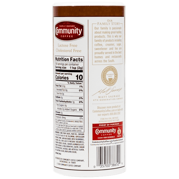 Our signature creamer is the perfect addition to your daily cup of Community® coffee. This non-dairy creamer is rich, creamy, lactose-free, cholesterol-free and low-fat. With an easy-to-pour flip-top lid, it's easy to add just the right amount and enjoy every cup just the way you like it. Perfect for offices, businesses and foodservice operations.