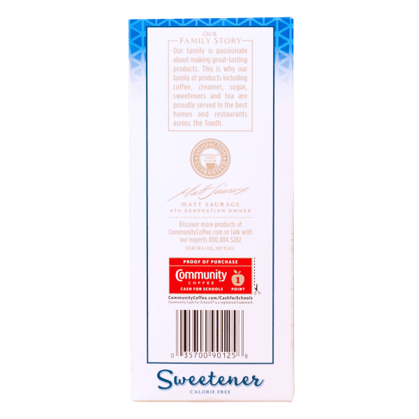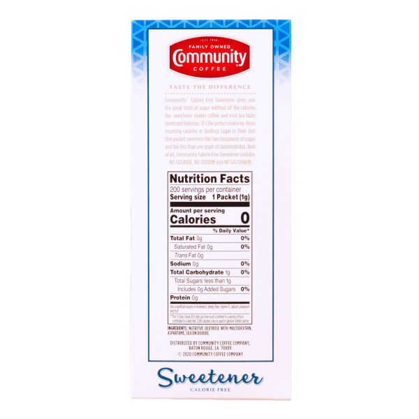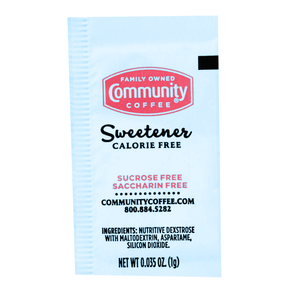 Community® Calorie Free Blue Sweetener gives you the great taste of sugar without all the calories. Our sweetener makes coffee and tea taste sweet and delicious. It’s the perfect choice for those counting calories or limiting sugar in their diet. Dissolves quickly hot or cold. One pre-portioned packet sweetens like two teaspoons of sugar and has less than one gram of carbohydrates. Best of all, this Community Calorie Free Sweetener contains NO SUCROSE, NO SODIUM and NO SACCHARIN.