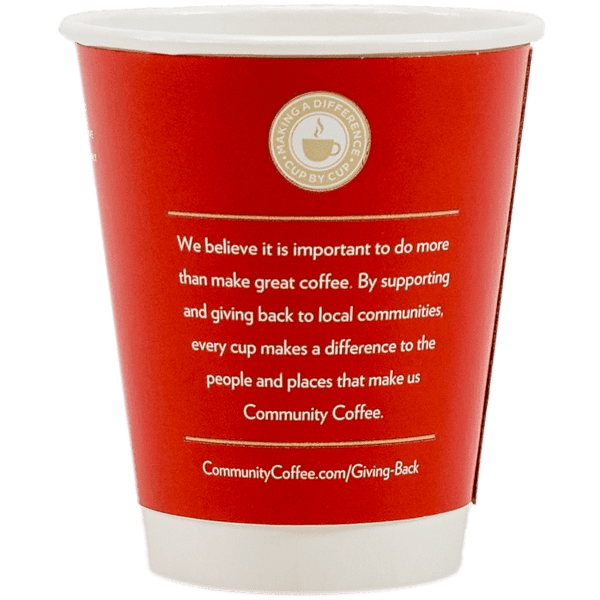 This environmentally conscious double wall hot beverage cup provides a versatile solution for on-the-go beverages. The combination of sturdy construction and high-quality Community Coffee branded graphics appeals to the customer, letting them know they are purchasing a premium beverage.